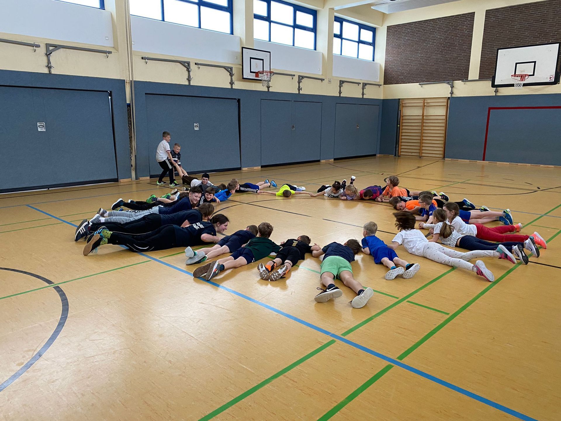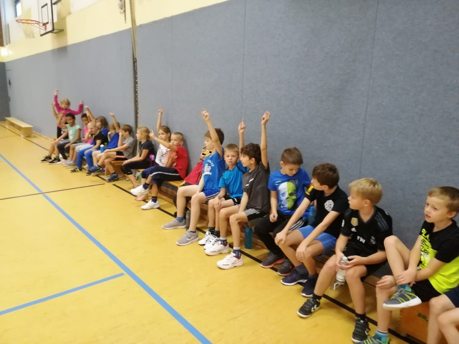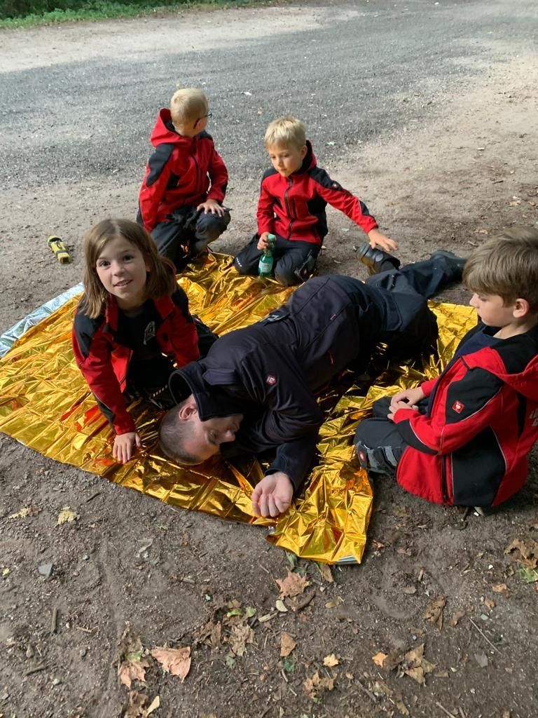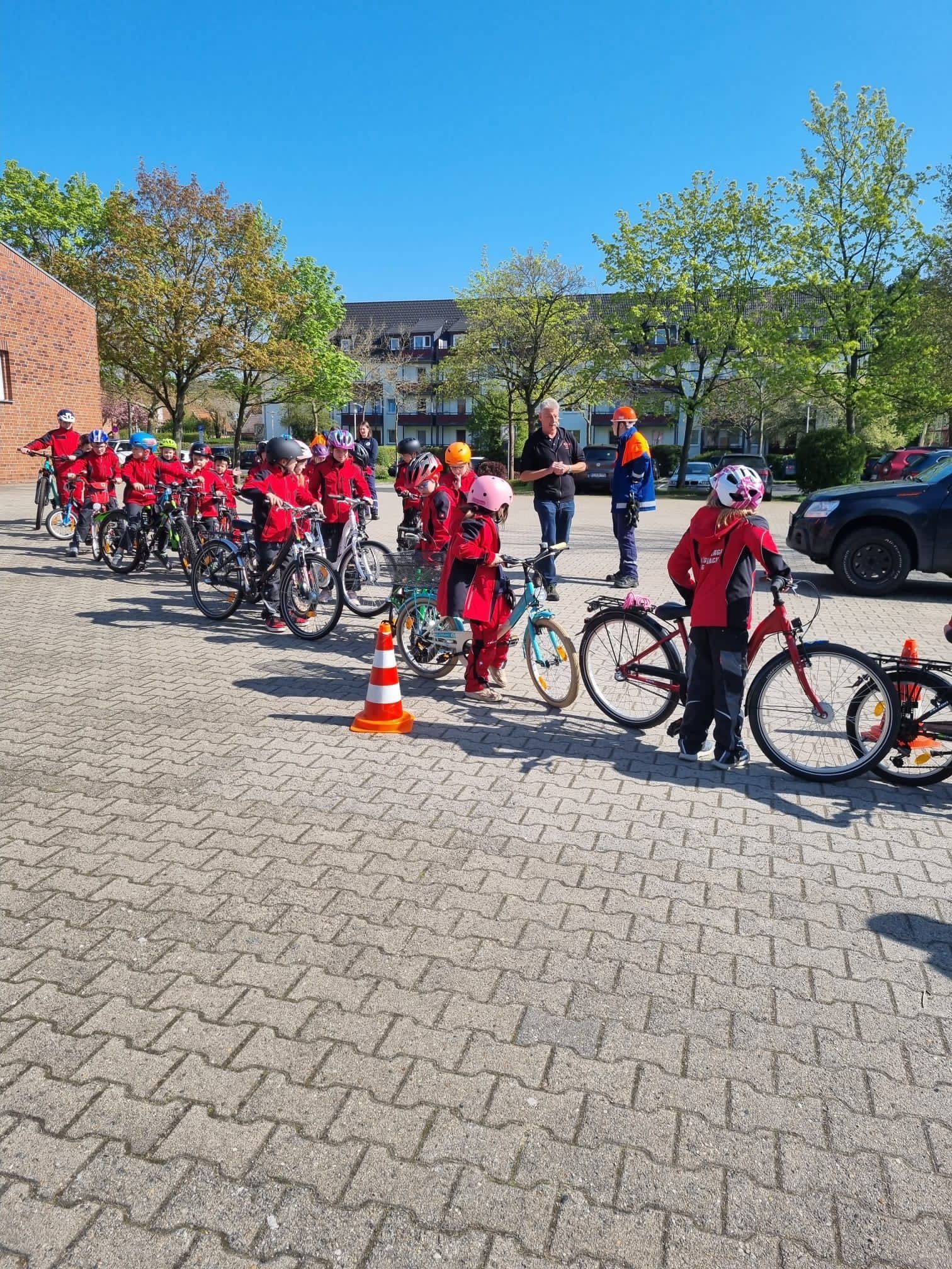 Jeder kleine Retter bringt sein Fahrrad und seinen Helm mit und es geht im Slalom um die Verkehrsleitkegel bis zum Abbiegen, was geübt werden muss.