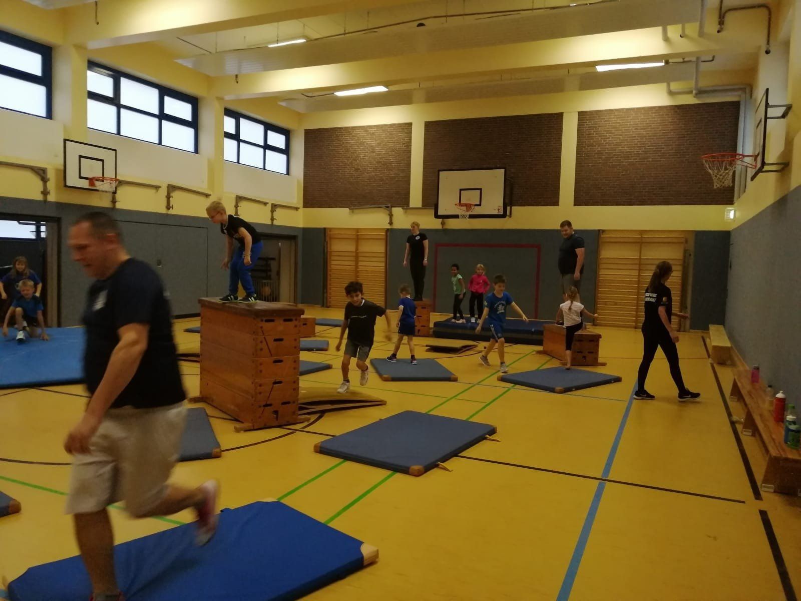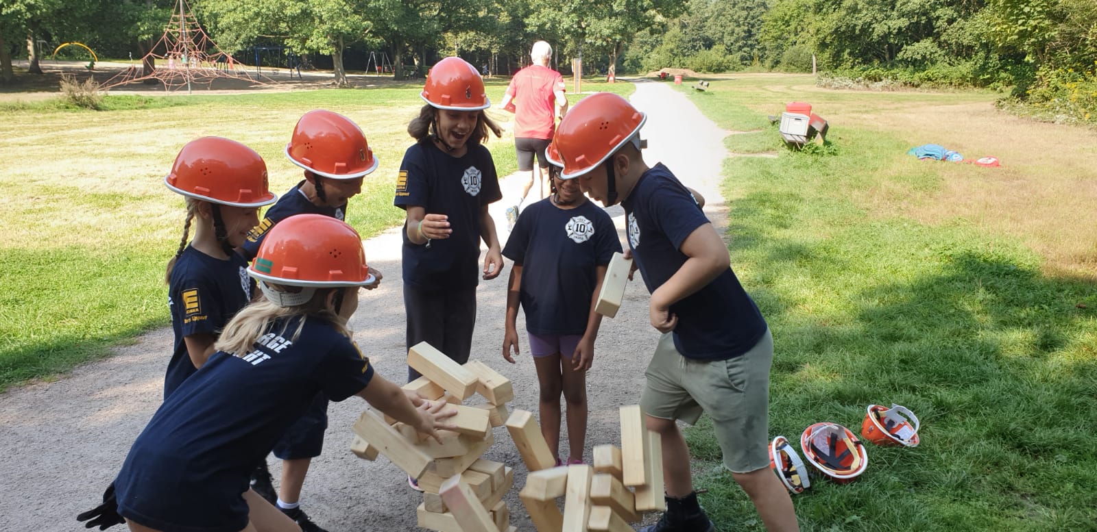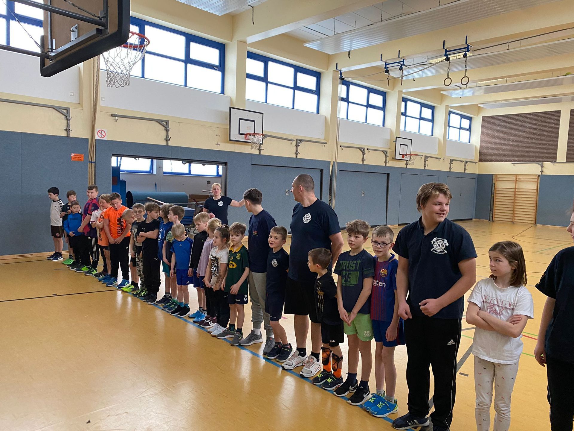 Jeder kleine Retter bringt sein Fahrrad und seinen Helm mit und es geht im Slalom um die Verkehrsleitkegel bis zum Abbiegen, was geübt werden muss.