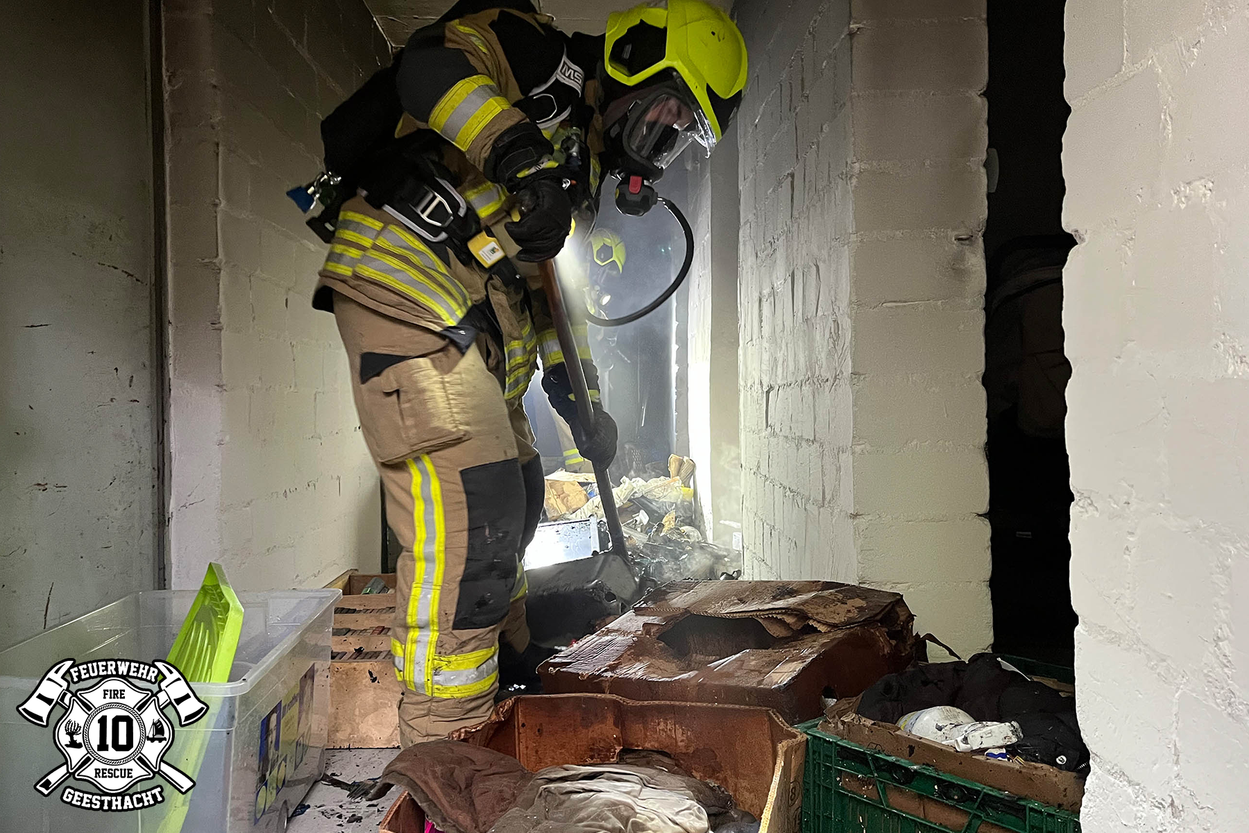 Es ging wieder zu einem Kellerbrand an die gleiche Adresse wie zuvor. Vor Ort brannte in einem weiteren Keller Unrat und Mobiliar. Sieben Personen und 2 Katzen mussten durch das verrauchte Treppenhaus gerettet werden. Die Bewohner wurden durch den Rettungsdienst gesichtet und teilweise ins Krankenhaus gebracht. Nachdem das Gebäude geräumt war, konnte der Keller gelöscht und das Gebäude belüftet werden.