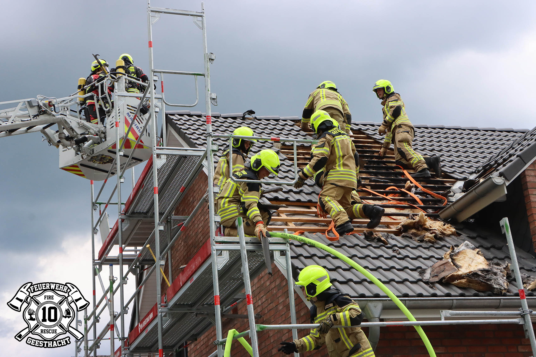 Am 05. Juni 2025 um 12:52 Uhr wurden wir, gemeinsam mit der Feuerwehr Lauenburg, von der Leitstelle mit dem Alarmstichwort „FEU G“ zu einem Dachstuhlbrand gerufen. Bei unserer Ankunft an der Einsatzstelle war bereits eine deutliche Rauchentwicklung im Dachbereich, insbesondere am Übergang zur Gaube, sichtbar. Die Anwohner hatten vor unserem Eintreffen bereits erste Löschversuche mit einem Gartenschlauch unternommen. Ein Trupp unter Atemschutz verschaffte sich umgehend Zugang zum Dach, indem er das aufgestellte Baugerüst nutzte. Mit einem C-Strahlrohr begannen sie zügig mit der Brandbekämpfung, um die brennenden Dachlatten und die Dämmung zu löschen. Parallel dazu kontrollierte die Feuerwehr Lauenburg mit ihrer Drehleiter den First des Daches mithilfe einer Wärmebildkamera, um etwaige Glutnester zu lokalisieren. Während sich der Angriffstrupp im Gerätewagen Hygiene umkleidete, nahmen andere Kameraden vorsichtig von Hand etwa 12 m² der betroffenen Dachfläche auf und kühlten die heißesten Stellen mit einem D-Strahlrohr ab. Nach ungefähr 90 Minuten Einsatzdauer übergaben wir die Einsatzstelle an die Polizei und kehrten zu unserem Standort zurück. Bericht: A. Klammroth Foto/s: T.Jann/ Lübecker Nachrichten