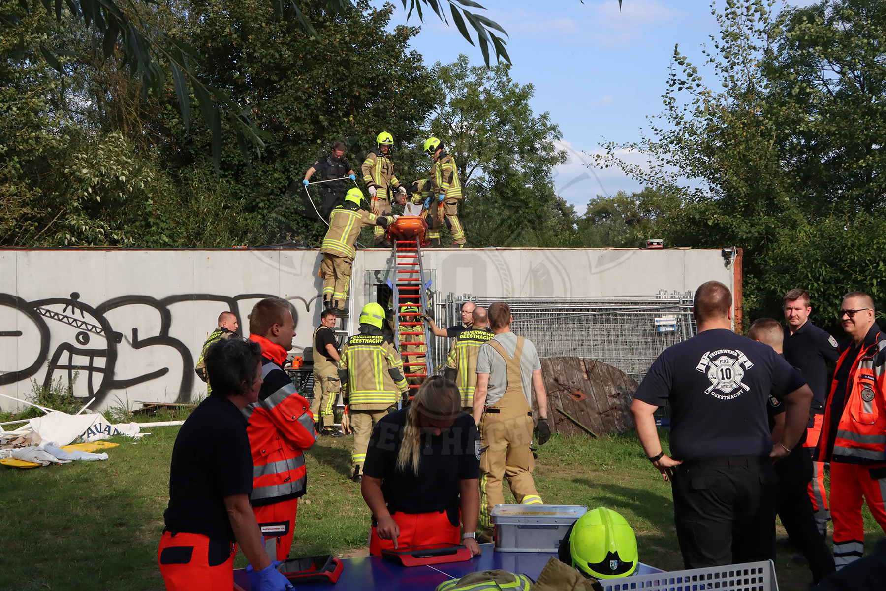 Schon in der Meldung hieß es, das eine nicht ansprechbare Person auf einem Dach eines Containers liegt. Nachdem wir über tragbare Leitern dem Rettungsdienst den Zutritt auf das Dach ermöglicht hatten, wurde unsere Gewissheit wahr. Leider konnte die Notärztin nur noch den Tod der Person feststellen. Mit einer Schleifkorbtrage über die Leiter holten wir die Person vom Dach und übergaben sie der Polizei.