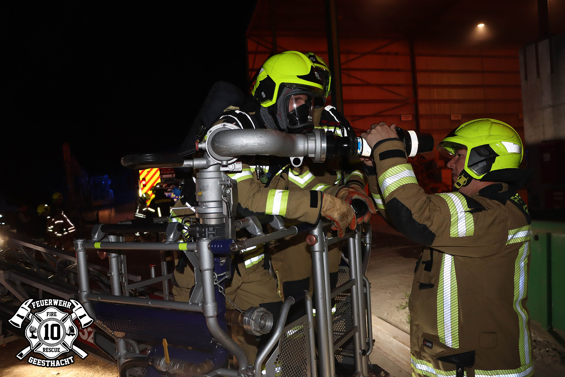 Geschützt durch Atemschutzgeräte wurde das Feuer mit 3 Strahlrohen und dem Wenderohr unserer Drehleiter gelöscht.