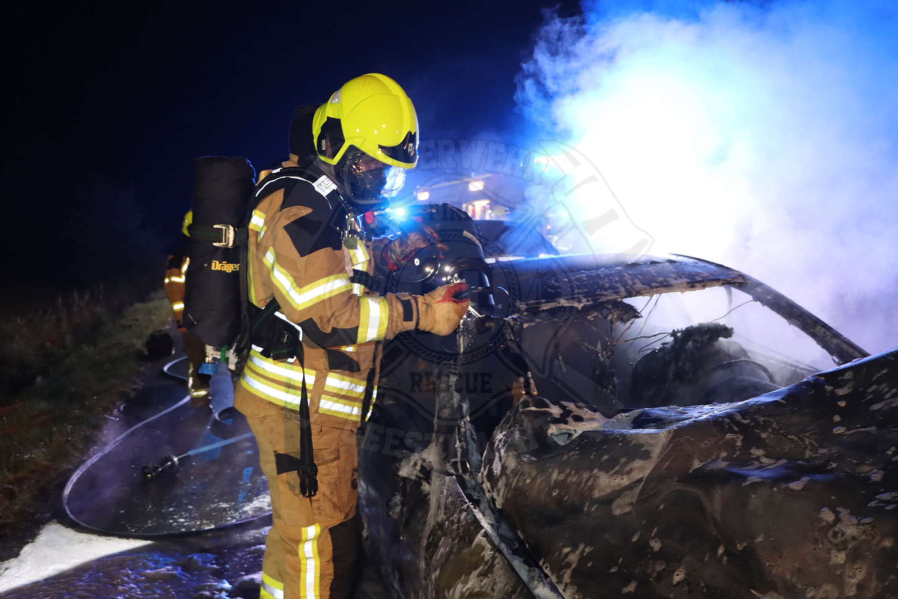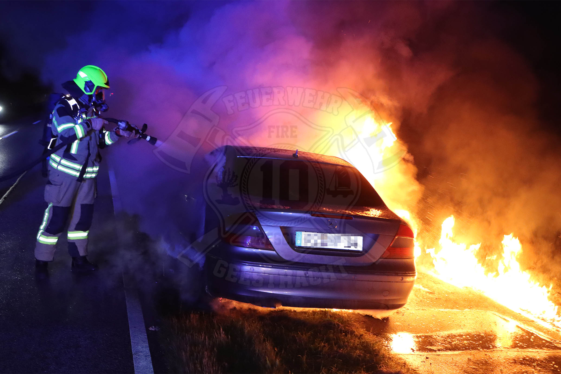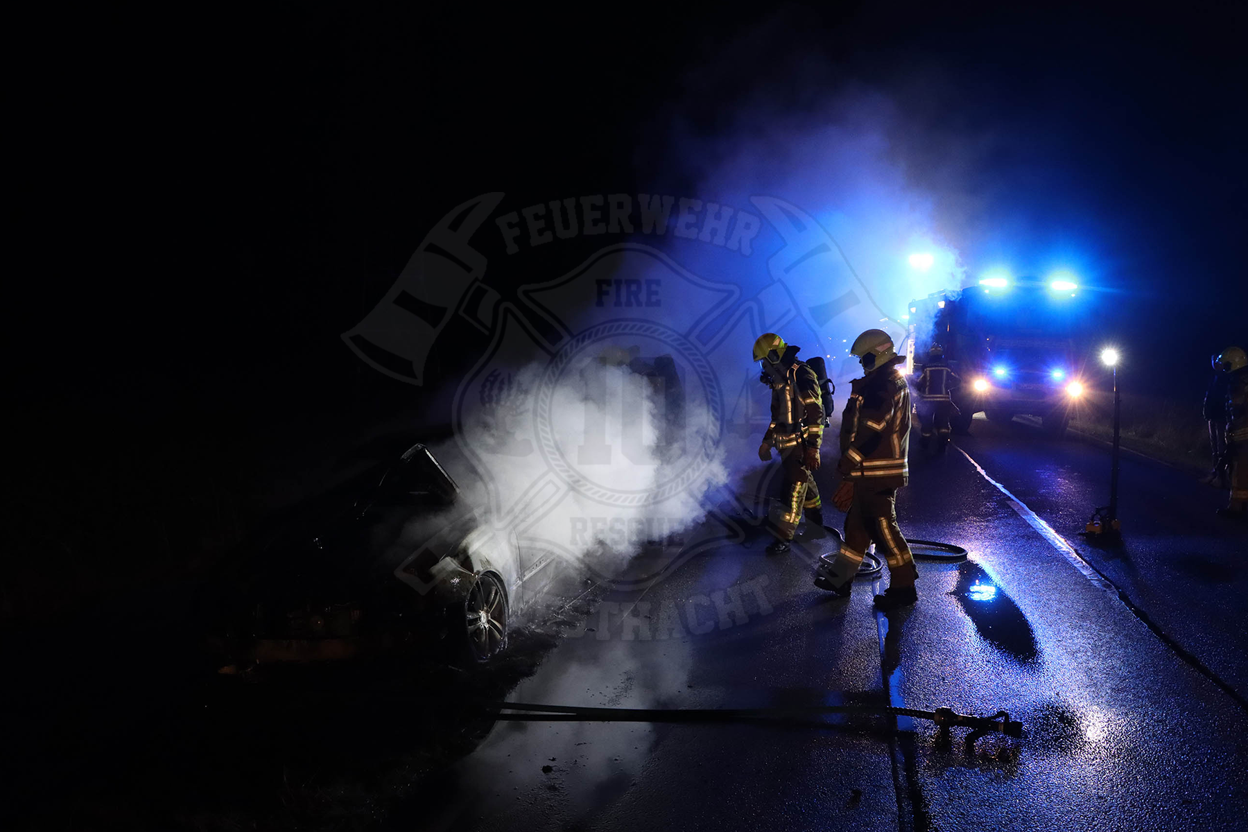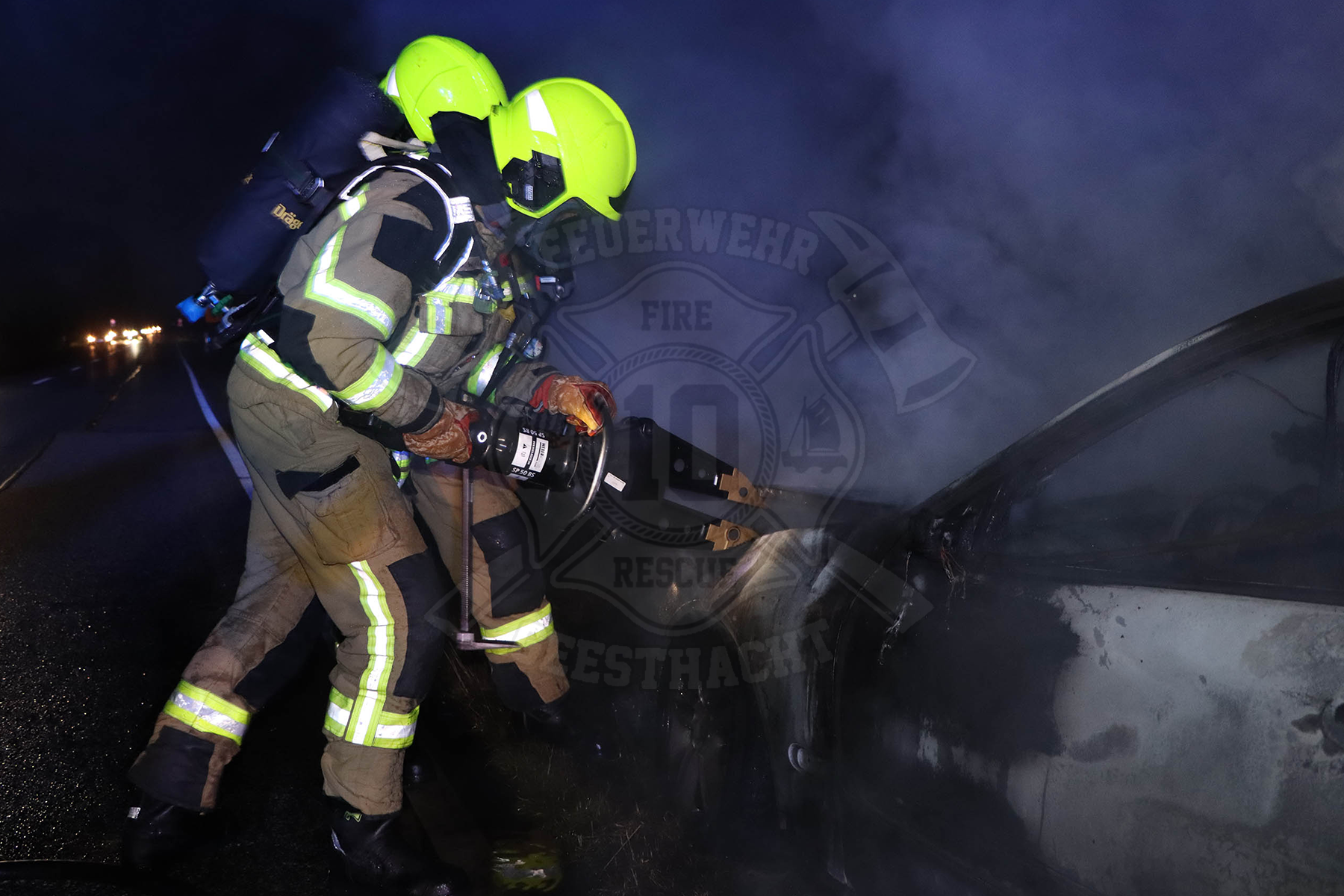 Kurz vor dem Dienst am 07.10.2024 hieß es für uns "PKW Brand" auf der B404 Richtung Hohenhorn. Bei unserem Eintreffen stand der PKW bereits in Flammen. Vom erst eintreffenden TLF4000 wurde sofort die Brandbekämpfung eingeleitet, damit das Feuer nicht auf den Grünstreifen übergreift. Der Angriffstrupp des HLFs ging dann unter Atemschutz mit Wasser und Schaum zum Löschen des PKWs vor. Da das Feuer durch eine defekte Kraftstoffleitung unter dem Fahrzeug immer wieder aufflammte, musste das Fahrzeug angehoben werden, um effektiv löschen zu können. Nachdem die Motorhaube geöffnet wurde, konnten auch die restlichen Brandnester abgelöscht und mit Schaum erstickt werden..
