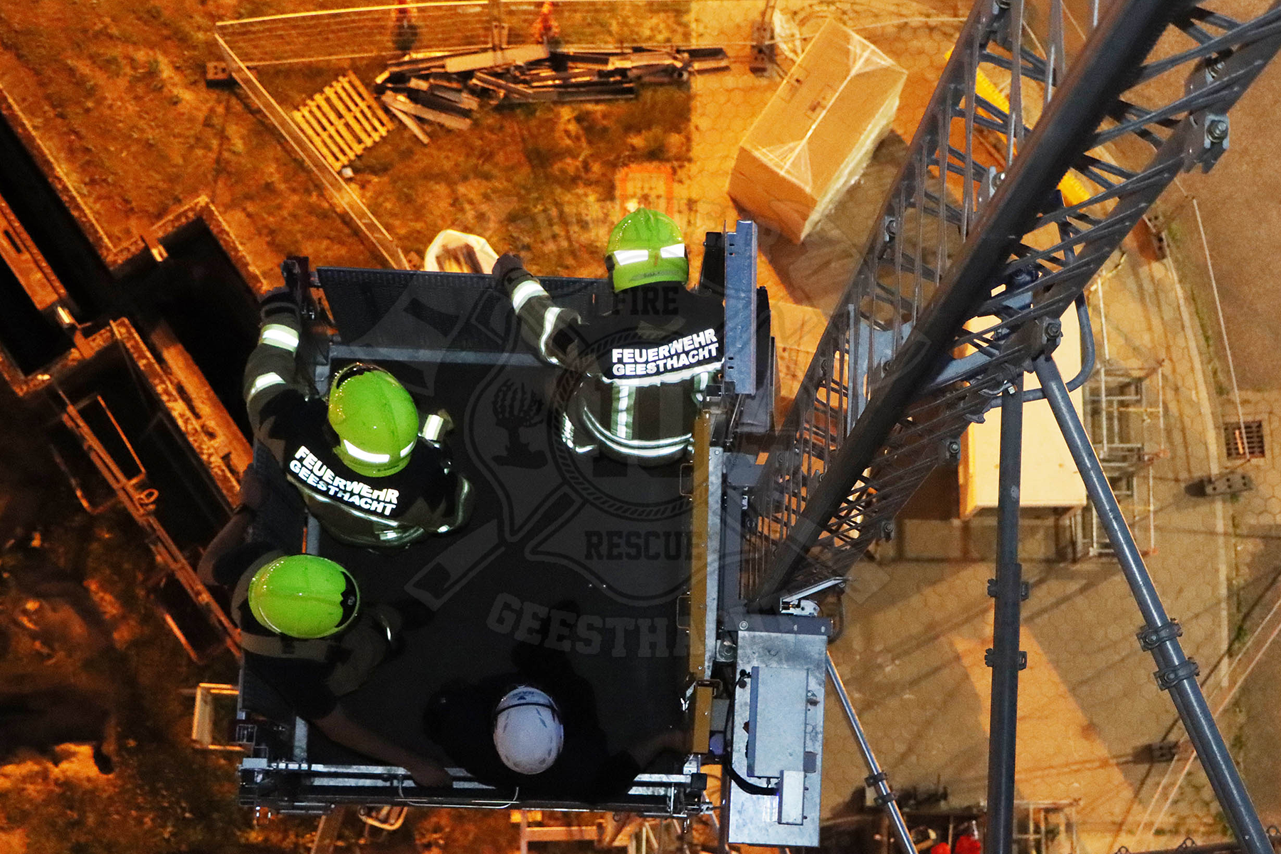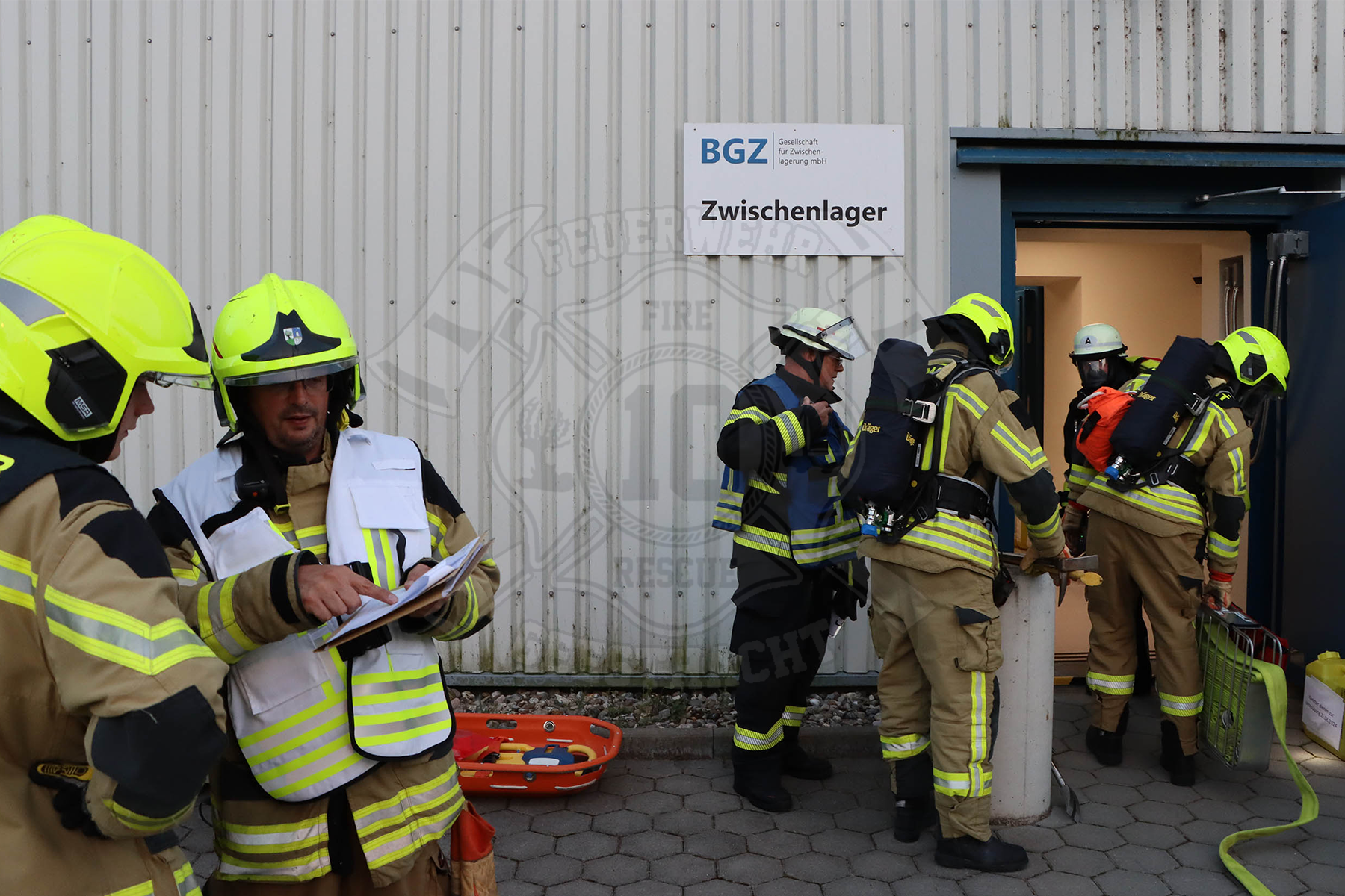 Zuerst musste ein vermisster Arbeiter im Zwischenlager gesucht und gerettet werden. Ein angenommener Brand wurde bekämpft und ein Zwischenfall im Kontrollbereich wurde abgearbeitet. Auf dem Weg zum Zwischenlager wurde der 500 kg schwere Sicherungsriegel mit dem Kran der Drehleiter aus dem Tor gehoben, so hatten wir uns einen Zugang mit unseren Fahrzeugen verschafft.