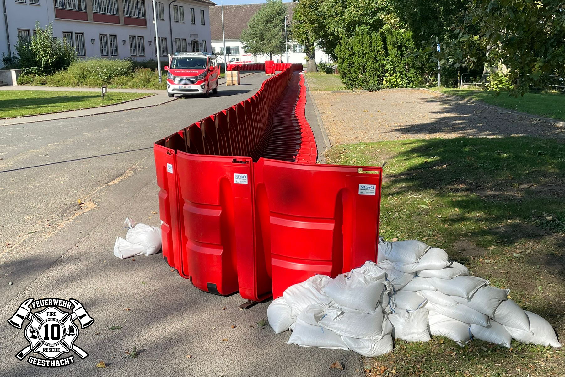 Am Übungsort bauten die Kräfte zwei unterschiedliche Hochwasserschutzsysteme auf und führten zusätzlich eine umfangreiche Brandübungsstation durch.