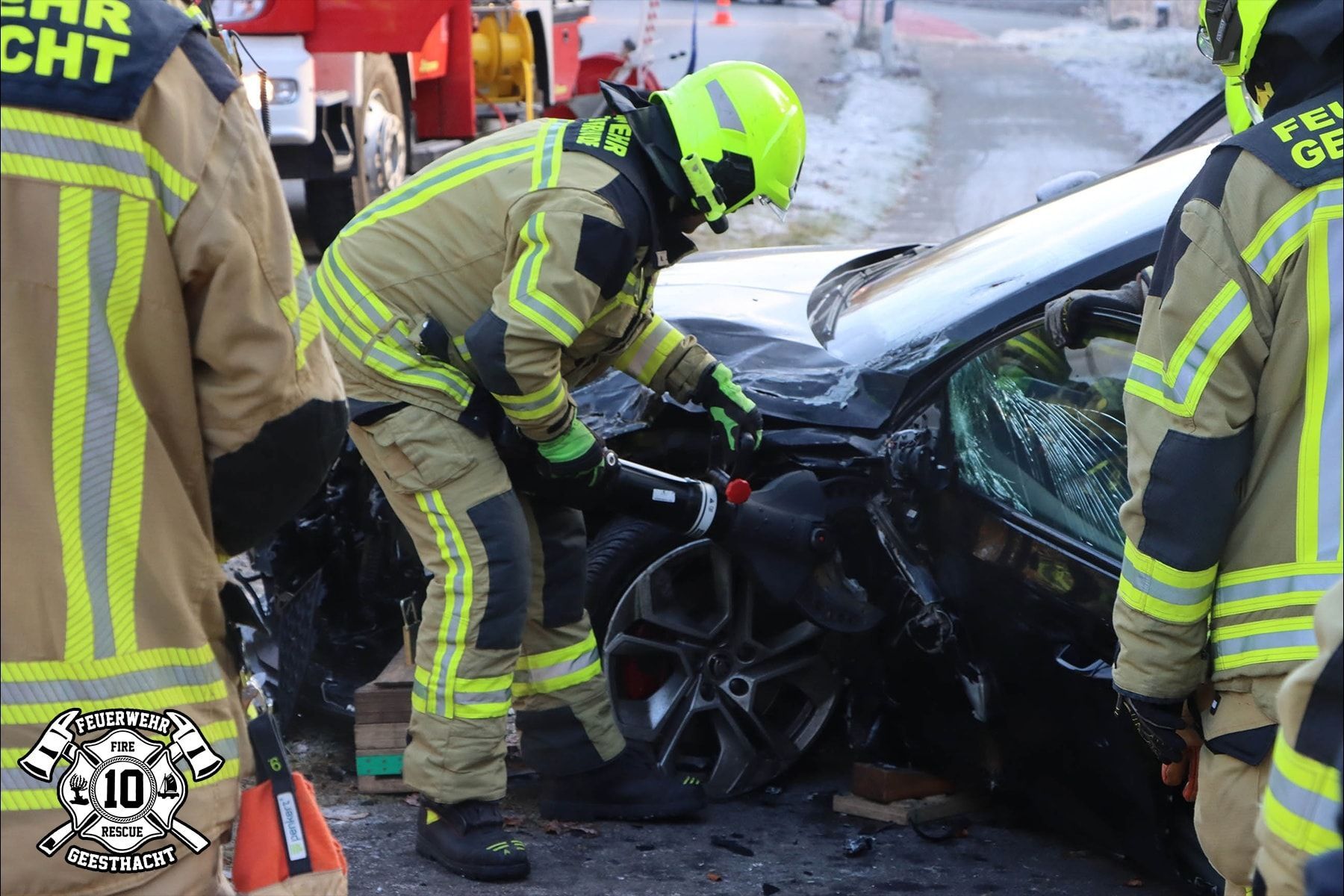 Am 22.11.25 um 10:02 Uhr wurde die Gemeindefeuerwehr Geesthacht auf die B5 Höhe Grüner Jäger gerufen. Aus ungeklärter Ursache ereignete sich dort ein Verkehrsunfall. Zwei Fahrzeuge stießen frontal zusammen. Während ein Fahrer selbstständig aus seinem PKW aussteigen konnte, musste der 2.Fahrer mit hydraulischem Rettungsgerät aus seinem Fahrzeug befreit werden. Dazu wurde auf der Fahrerseite eine große Seitenöffnung geschnitten, um den Fahrer mit einem Rettungsbrett schonend zu befreien und dem Rettungsdienst zu übergeben.